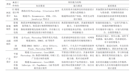 数字媒体产业可分为数字游戏、数字动漫、数字创意设计、数字传媒、数字出版、数字影音六个领域,其中,数字游戏和数字动画是目前数字媒体行业的核心领域,数字媒体技术广泛应用于计算机动画、数字游戏、数字视频、互联网教育、数字出版、VR 和数字文化创意等领域。根据职友集招聘数据显示,目前数字媒体技术人才需求分别为网页设计 4582 个职位、广告设计 2693 个职位、影视制作 953 个职位、动画制作 855 个职位,网页设计类行业提供的职位数目最多,广告设计类行业次之。总而言之,目前市场对数字媒体技术专业人才的需求非常大。通过浏览前程无忧招聘网不同类别行业的上千条招聘信息,分别统计出网页设计类、影视制作类、动画制作类、广告设计类行业以及相关岗位的能力要求。综合以上内容可以得到如下结论: