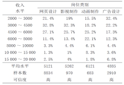 从人才层次上看,数字媒体技术同其他专业一样,市场需求同样涵盖各个学历层次,主要有高中层次、中专层次、专科层次、本科层次等。网页美工、影视制作、动画制作、广告设计各类行业人才层次比例统计如表2所示(数据来源于职友集)。按网页美工、影视制作、动画制作、广告设计相关的职位进行统计,各类行业岗位初入职薪酬待遇统计如表3所示(数据来源于职友集)。由表3数据可以看出,该专业从业薪酬幅度为2000~20000元/月,其中各类行业占比最高为:网页设计类3000~4500元/月,为32.8%;影视制作类3000~4500元 / 月,为32.3%;动画制作类4500~6000元/月,为25.2%;广告设计类2000~3000元/月,为32.4%。平均薪酬分别为网页设计类5121元/月、影视制作类5262元 /月、动画制作类6121元/月、广告设计类4885元/月。